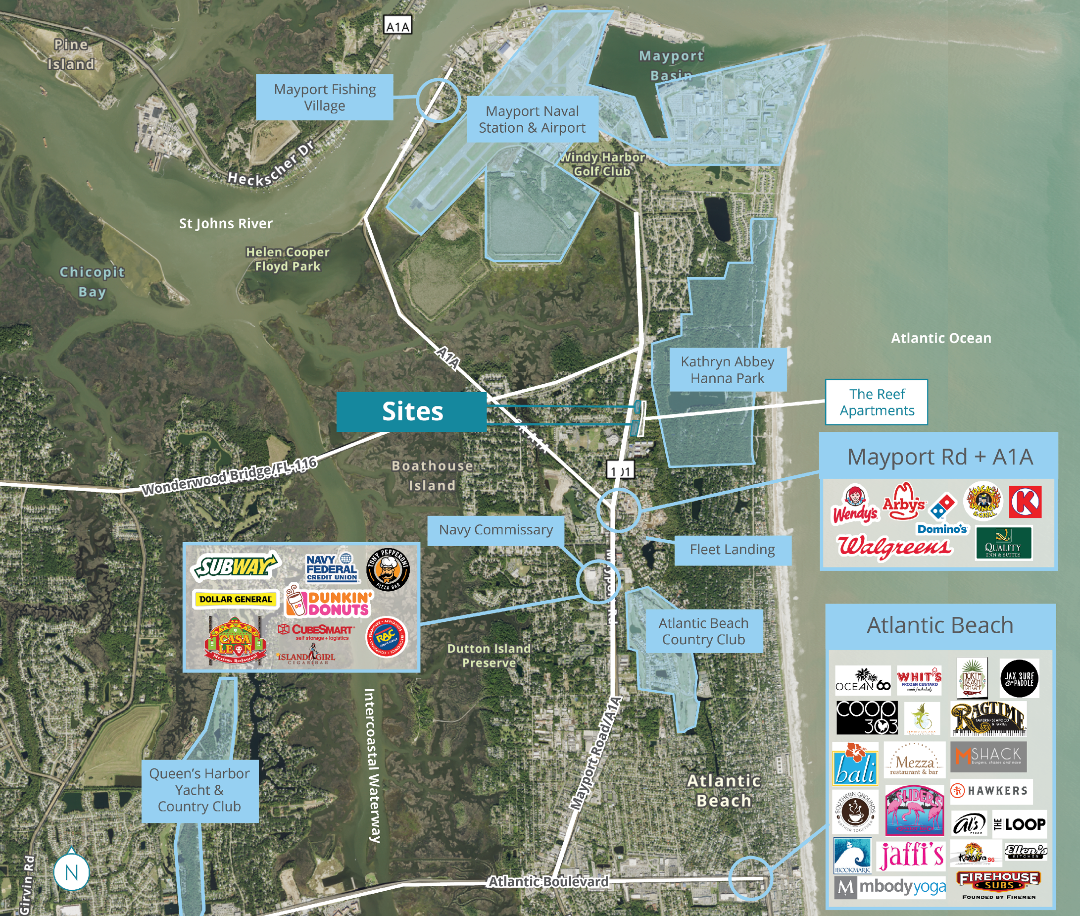 "The Reef" development is located on AIA in Atlantic Beach, Florida. It consists of two multi-tenant retail shopping center, the 456-unit luxury Reef Apartment complex and three outparcels which are on the market for ground lease or build-to-suit opportunities.